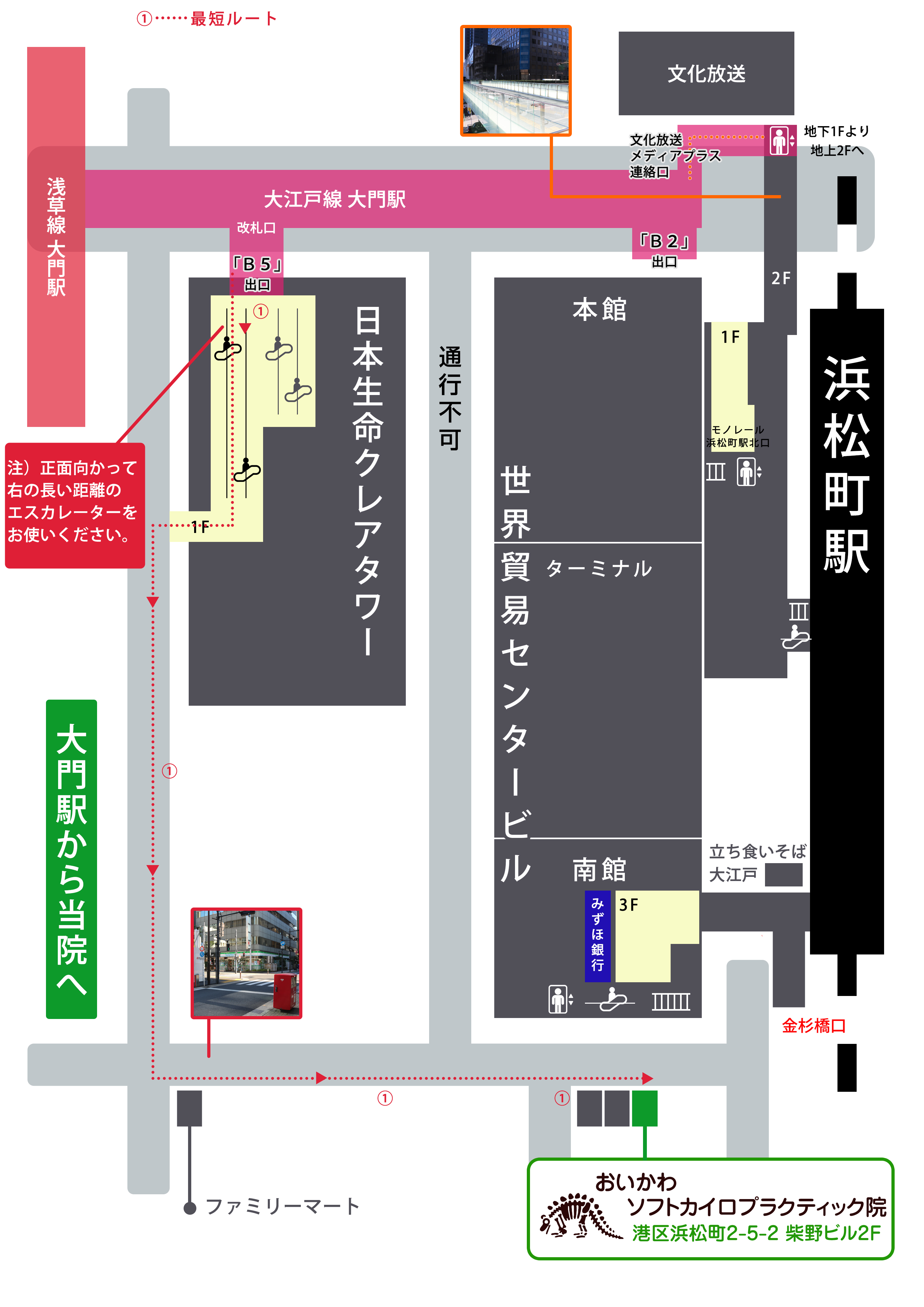 当院は浜松町駅世界貿易センタービル南館出口から30秒の場所にあり、駅より非常に近い所にあります。